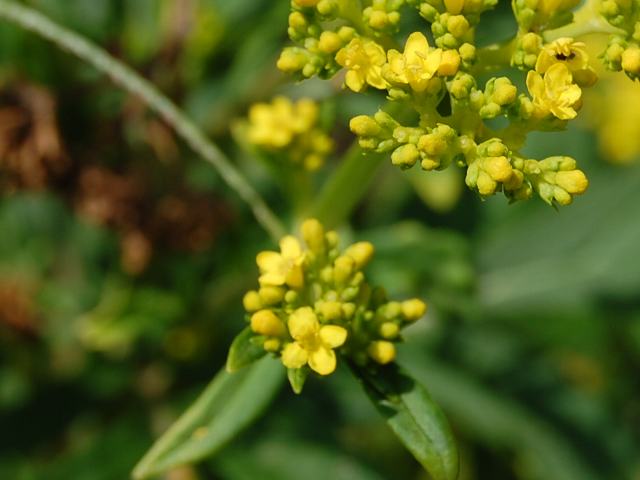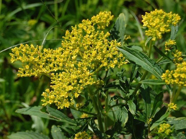 茎の上部で枝分かれをして散房花序(柄のある花がたくさんつき、下部の花ほど柄が長いので花序の上部がほぼ平らになる)を出し、黄色い小さな花をたくさんつける。