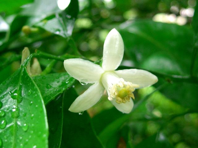枝先の葉の脇に香りの良い白い5弁花をつける。
