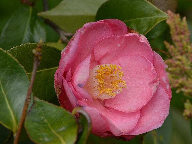 肥後椿は梅しべといって雄しべが放射状に開くのが特徴である。