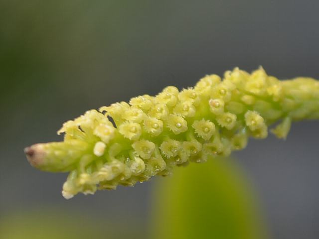 花茎を垂らして総状花序(柄のある花が花茎に均等につく)を出し、花径3ミリくらいの小さな緑色の花を穂状にたくさんつける。