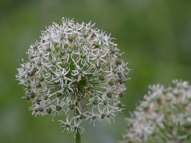 葉のない細い茎先に、球状をした大きな散形花序(たくさん枝が出て、先に1個つずつ花がつく)を出し、白い花をつける。