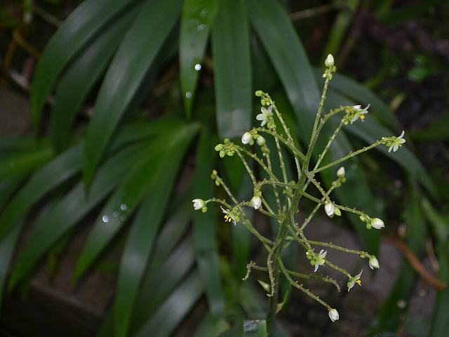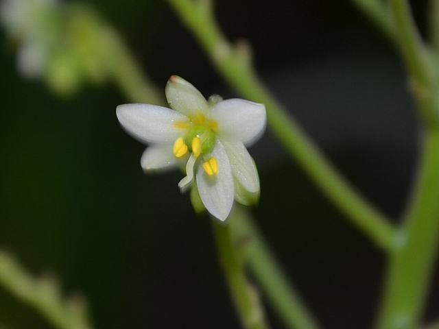 葉の脇から花茎を伸ばして円錐花序(下のほうになるほど枝分かれする回数が多く、全体をみると円錐形になる)を出し、白い小さな花をたくさんつける。