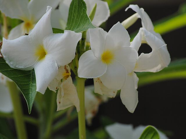 枝先に集散花序(最初の花が枝先につき、その下に次々と側枝を出して花がつく)を出し、花径8センチくらいの白い大きな花をつける。