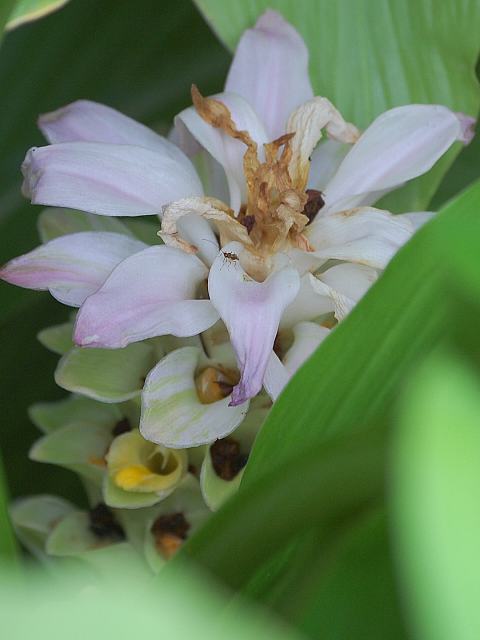 花は肉質で白っぽく、先が淡い紫色を帯びる。