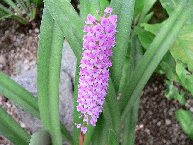 茎先に円筒状の総状花序(柄のある花が花茎に均等につく)を出し、花径15ミリくらいの紅紫色の花を密集してつける。