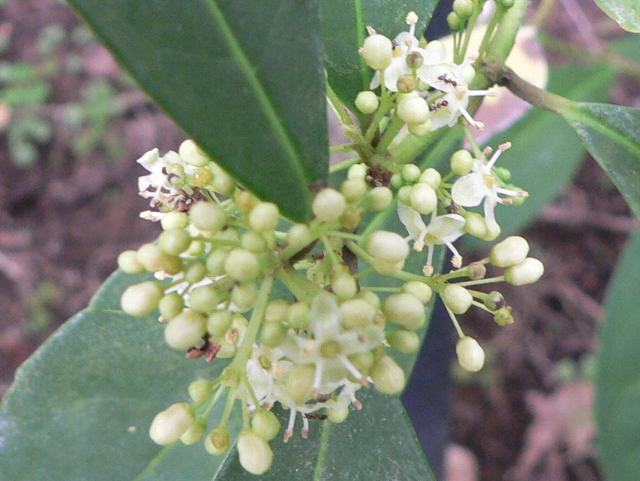 枝先に集散花序(最初の花が枝先につき、その下に次々と側枝を出して花がつく)を出し、白い小さな花をたくさんつける。
