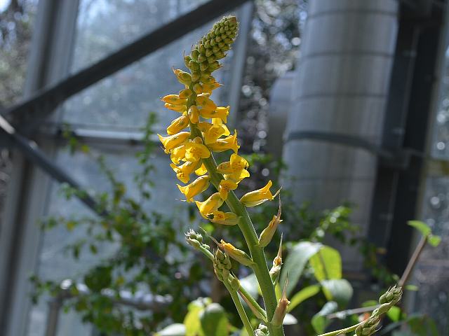 80センチくらいある長い茎を伸ばし、茎先に総状花序(柄のある花が花茎に均等につく)を出して黄色い筒状の花をつける。