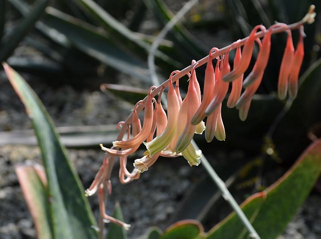 伸ばした茎先に総状花序(柄のある花が花茎に均等につく)を出し、長さ4センチくらいの淡い朱色をした筒状の花をつける。