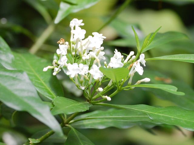 蓬莱青木(ホウライアオキ)はキョウチクトウ科インドジャボク属(ラウボルフィア属)の常緑低木である。