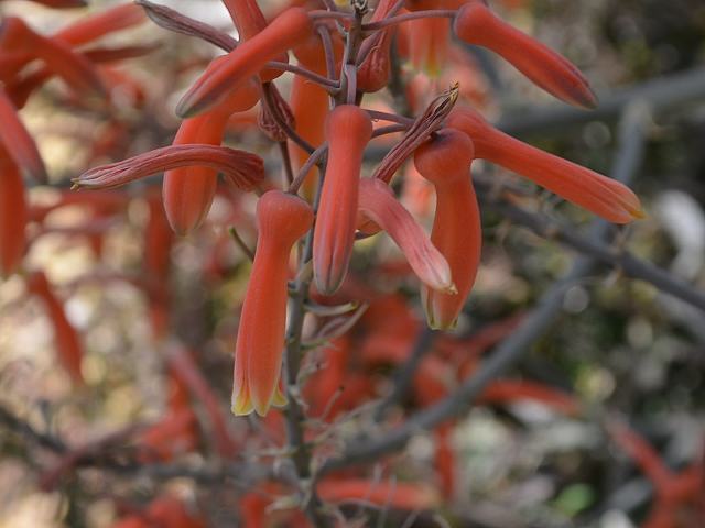 茎先に総状花序(柄のある花が花茎に均等につく)を出し、オレンジ色をした筒状の花を垂れ下げる。
