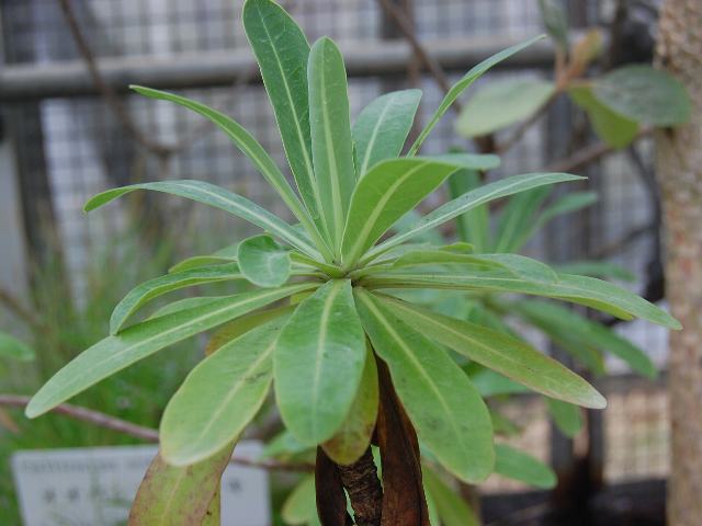 葉は幅の狭い楕円形で、枝先に輪生状に互い違いに生える(互生)。