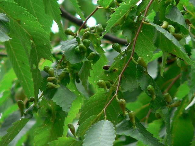 花の後にできる実は直径5ミリくらいの歪んだ球形の翼果(翼のある実)で、葉のつけ根につく。