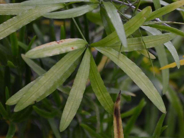 暗い緑色をしており、枝先に3~5枚ずつつく。