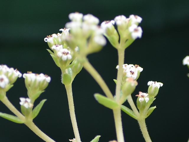 葉の脇から花茎を伸ばして集散花序(枝先に花がつき、その下から枝が出て花をつけることを繰り返すもの)を出し、白い小さな花をたくさんつける。